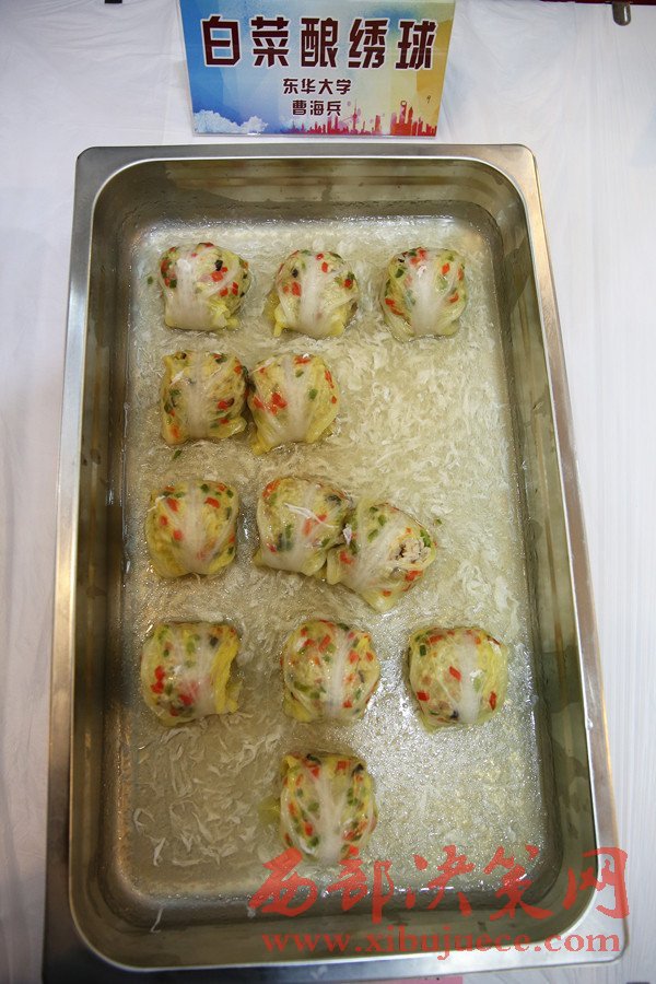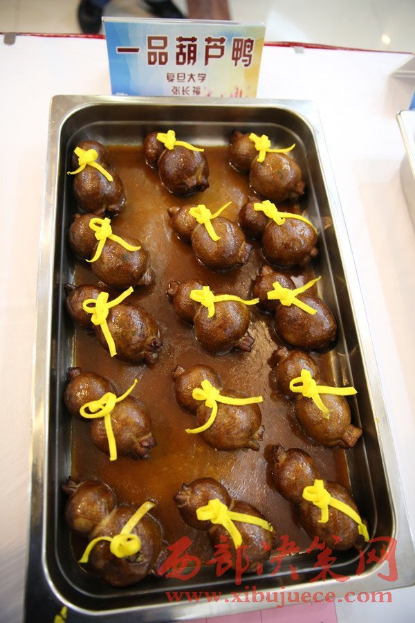 在長達數(shù)個小時的比賽中,來自37所上海高校的100多位廚師輪流上陣,共制作出菜品111個。圖為復旦大學一品葫蘆鴨。