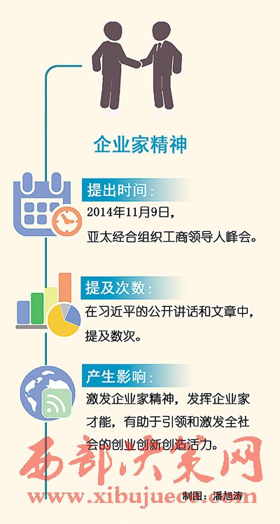 “我們?nèi)嫔罨母?,就要激發(fā)市場蘊(yùn)藏的活力。市場活力來自于人,特別是來自于企業(yè)家,來自于企業(yè)家精神。”2014年11月9日,在亞太經(jīng)合組織工商領(lǐng)導(dǎo)人峰會(huì)上,面對(duì)來自數(shù)十個(gè)國家和地區(qū)的1500多位工商界代表,國家主席習(xí)近平特別提及了企業(yè)家精神。