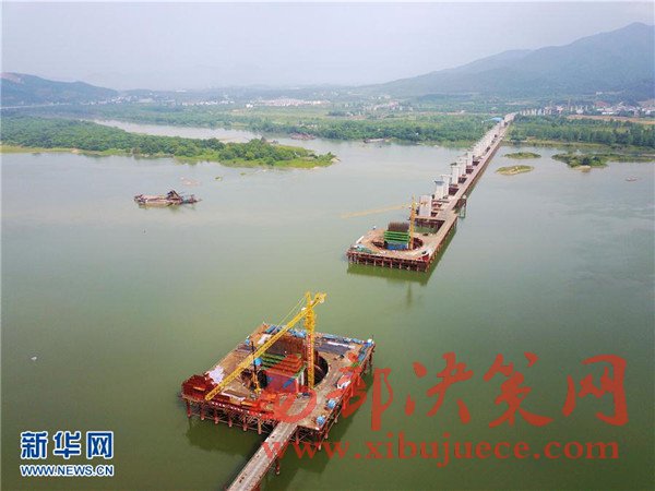 5月22日,中國鐵建二十二局的工人在蒙華鐵路贛江特大橋施工。