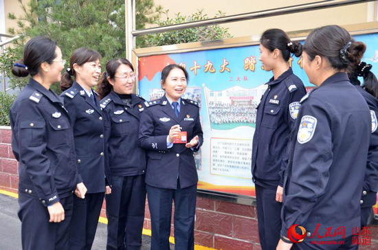 山東省女子強制隔離戒毒所醫(yī)療康復(fù)科科長李芙蓉向同事宣講十九大精神。劉桂珍 攝