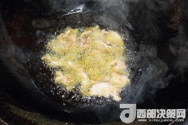 4.炒鍋倒多些油,燒至五六成熱,下肉片滑九分熟撈出