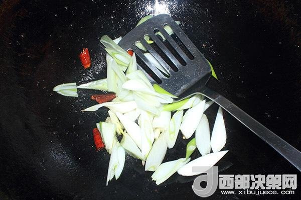 6.把油倒出來,留少許底油,先煸干辣椒,放大蔥大火炒一下出香氣