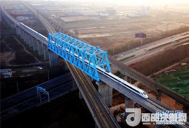 西成高鐵由西安北站駛出的列車(chē)經(jīng)過(guò)西成高鐵跨西寶高鐵特大橋(12月6日攝)。12月6日,西安至成都高速鐵路全線開(kāi)通運(yùn)營(yíng),兩地的最短旅行時(shí)間壓縮至4小時(shí)7分。