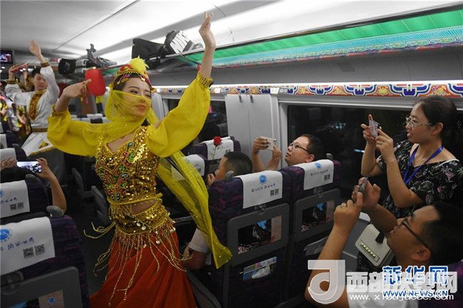 蘭州客運(yùn)段列車(chē)員在蘭州鐵路局開(kāi)行的首趟寶蘭高鐵G2028次動(dòng)車(chē)組上為旅客表演節(jié)目(7月9日攝)。7月9日,寶雞至蘭州高鐵正式開(kāi)通運(yùn)營(yíng),西北的甘肅、青海、新疆由此融入全國(guó)高鐵大家庭。