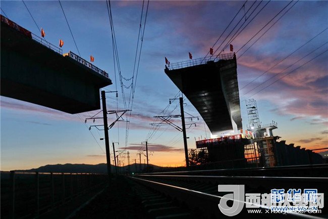 河北省懷來(lái)縣境內(nèi)的新建京張高鐵跨大秦鐵路線土木特大橋連續(xù)梁在轉(zhuǎn)體中(9月17日攝)。