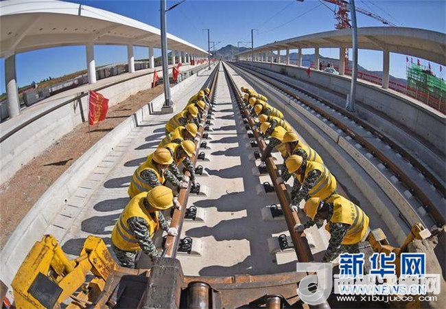 中鐵十九局工程人員在京沈高鐵凌源南站進(jìn)行鋪軌作業(yè)(9月28日攝)。(記者 楊青 攝)