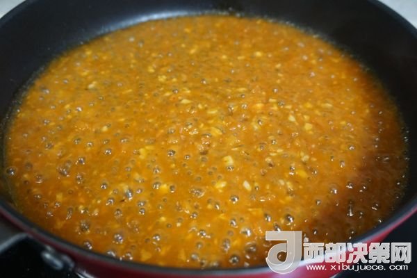 6、加入番茄碎和鹽,炒出番茄汁。
