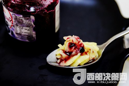 食材:土豆、濃縮雞汁、黃油、藍(lán)莓醬、黑胡椒。