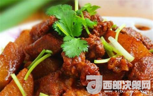 5、蓋上蓋子,燉1個小時,期間注意翻動幾次,防止鍋底焦掉,加入蘿卜塊,繼續(xù)燉半小時,如果湯還是很多,可以開大火燒,這樣湯汁收干的快一點,最后撒點香菜,出鍋裝盤即可。