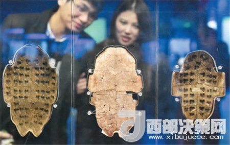 圖為游客在位于河南省安陽(yáng)市的殷墟博物館中參觀刻有甲骨文的卜甲。(圖片來(lái)源新華社李嘉南 攝)