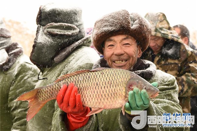 1月6日,在內(nèi)蒙古杭錦后旗鴻雁湖,捕魚人展示捕撈上來的魚。(支茂盛 攝)