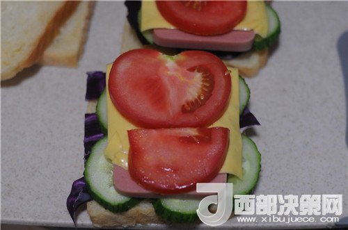 15.再放上芝士片和西紅柿片,蓋上一片土司,用油紙張包裹起來(lái),切開(kāi)即可