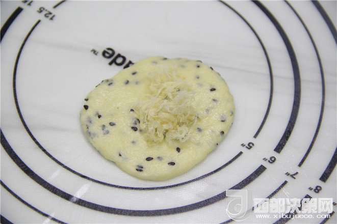 7.放入肉松,用虎口捏緊,收口朝下。