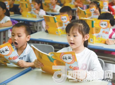 2017年8月31日,安徽合肥少兒藝術(shù)學(xué)校一年級(jí)學(xué)生在開學(xué)預(yù)備課上熟悉新編語(yǔ)文教材。(記者張端攝)
