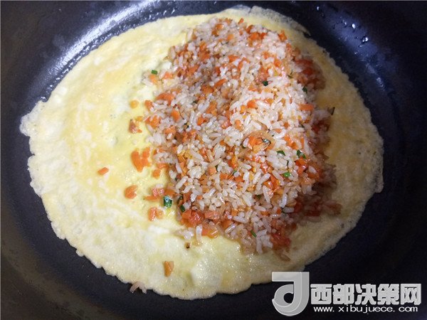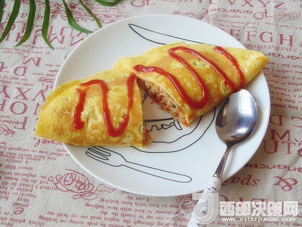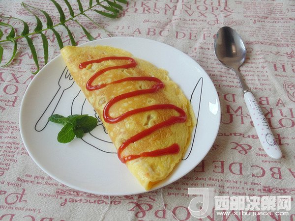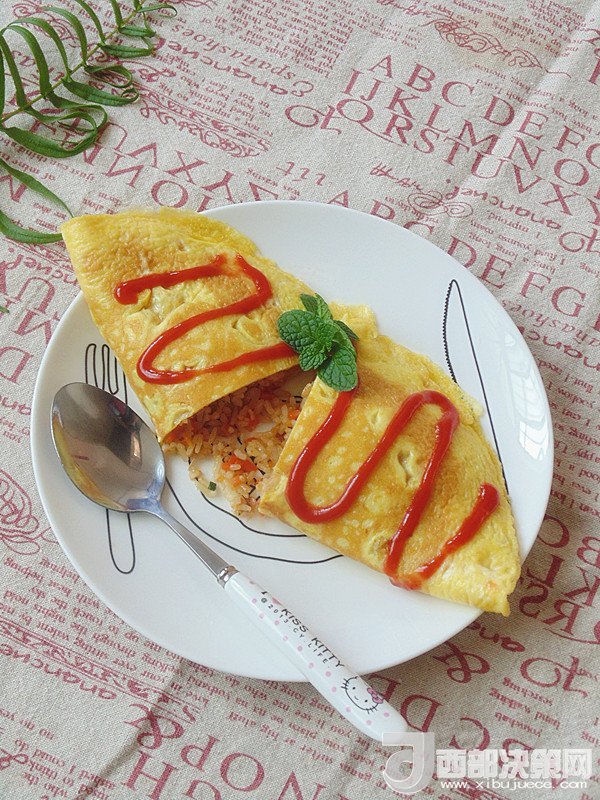14.將炒好的飯倒入煎好蛋皮的一側(cè),另一邊折過來邊緣對(duì)齊。擠上番茄沙司裝飾即可開吃。