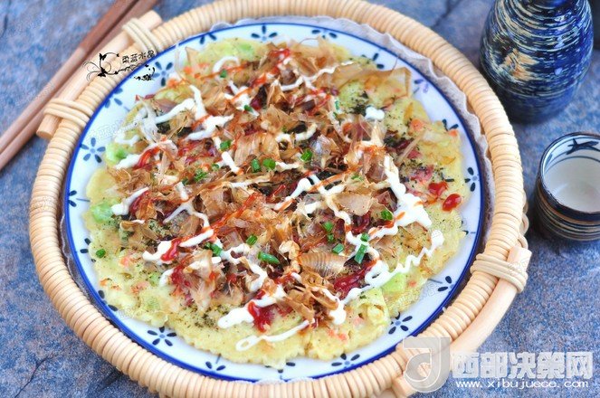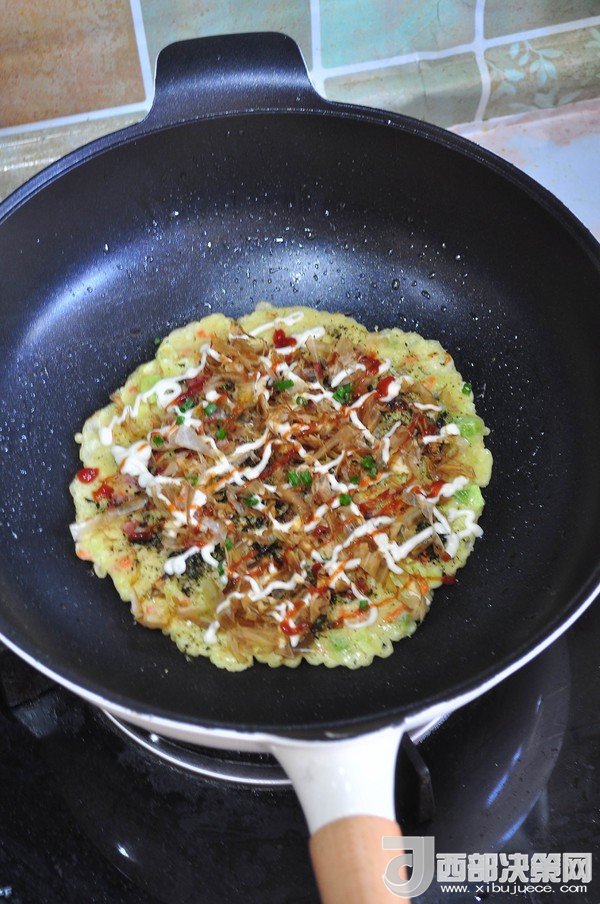“大阪燒是一種日式蔬菜煎餅,有些地區(qū)根據(jù)日文漢字的寫法,也叫做“御好燒”,為日本關(guān)西的一種民間美食,也是大阪飲食文化的代表。由于外觀的關(guān)系,也有人稱大阪燒為“日本式比薩餅”,可以說放上去的食材,并沒有特殊規(guī)定,一般是自己想吃什么就放什么。吃膩了中式的雞蛋薄餅,換個口味也別俱一格。做這個頂重要的是,一定要用不粘鍋,不然想翻面的時候,底部巴鍋底不動,而且還容易上面的沒熟,下面的已經(jīng)糊了。”