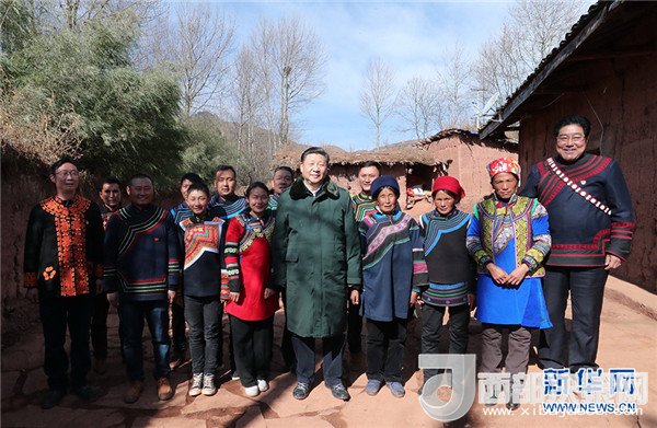 這是習(xí)近平在涼山彝族自治州昭覺(jué)縣三岔河鄉(xiāng)三河村貧困戶(hù)節(jié)列俄阿木家同鄉(xiāng)親們合影。記者 謝環(huán)馳 攝