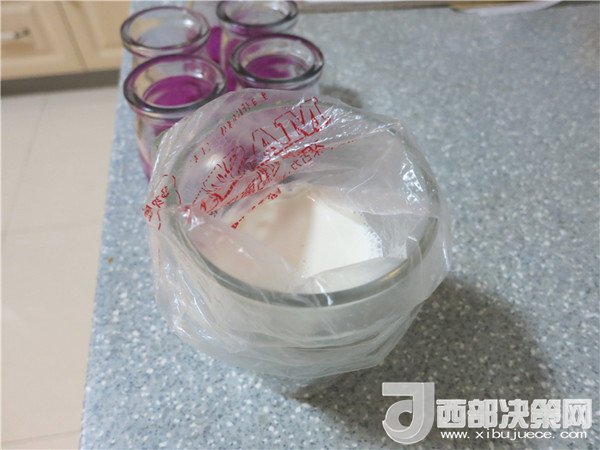 15.取出凝固的布丁瓶,將牛奶液均分注入瓶中,再次入冰箱冷藏至凝固