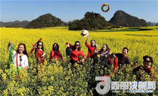 游客們?cè)谠颇鲜×_平縣的油菜花田里合影(2月28日攝)。新華社記者 藺以光 攝
