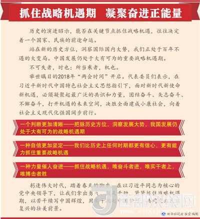 舉世矚目的2018年“兩會(huì)時(shí)間”開(kāi)啟。代表委員們表示,在習(xí)近平新時(shí)代中國(guó)特色社會(huì)主義思想指引下,面對(duì)新時(shí)代新使命新機(jī)遇,必須凝聚起最廣泛的共識(shí)和力量,團(tuán)結(jié)奮斗、矢志奮斗、不懈奮斗,打開(kāi)機(jī)遇的未來(lái)空間,決勝全面建成小康社會(huì),向著社會(huì)主義現(xiàn)代化強(qiáng)國(guó)闊步前行。