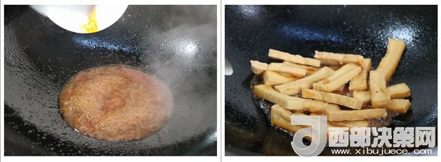 4.少許油 加入適量清水,辣醬(咸辣味,無蒜)、白糖放入鍋里攪拌勻。加入豆腐收汁,至半收汁時(shí),湯汁和豆腐一起 鏟起備用。