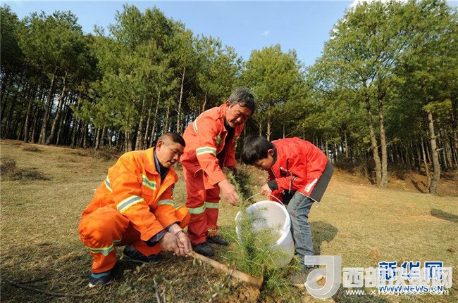 3月10日,沙子坡林場的護林員與他們的孩子在林區(qū)補植樹苗。