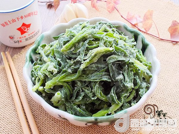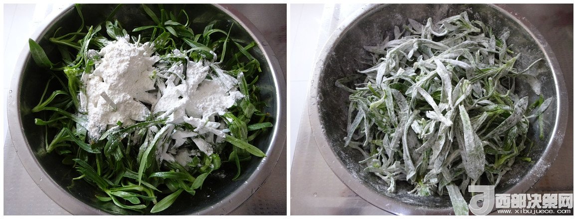 2.放入玉米淀粉和面粉,二者比例1:1,抓勻,使每片菜葉都裹上一層薄薄的粉,不用質(zhì)疑我為什么用一半的玉米淀粉,這樣做,蒸出來的菜口感好、顏色漂亮,不信您試試