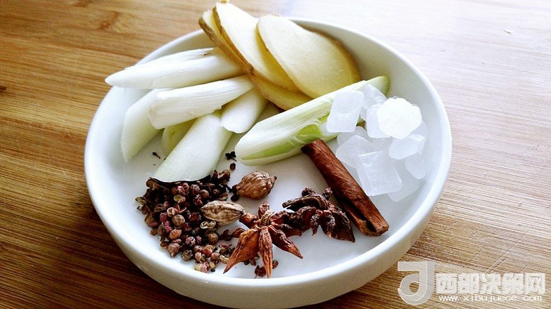 2.準(zhǔn)備:香料,大蔥,生姜冰糖,八角,草果,花椒粒。