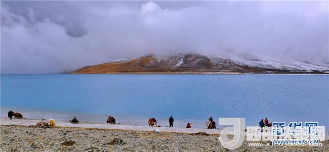 湖畔的牧民和牦牛(4月8日攝)。
