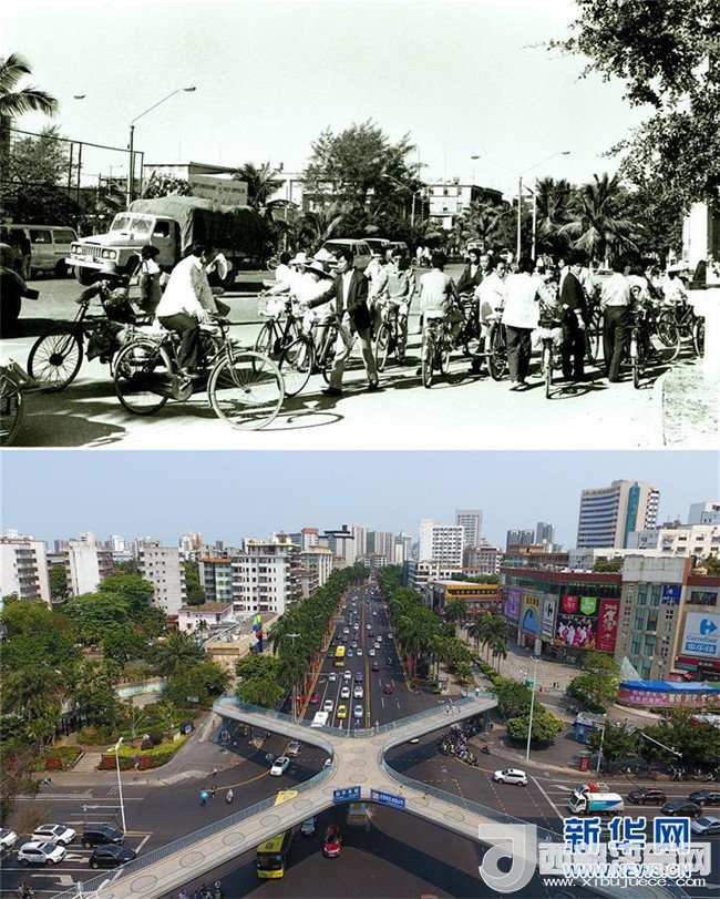 拼版照片為海口市龍昆南路今昔對比(上圖為1993年6月30日新華社記者姜恩宇攝,下圖為2018年4月14日新華社記者郭程攝)。