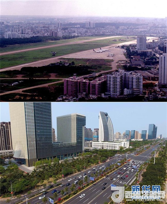 拼版照片為??谑袨I海大道南側(cè)的建筑物今昔對比(上圖為1990年1月10日新華社記者姜恩宇攝,下圖為2018年4月15日新華社記者趙穎全攝)。