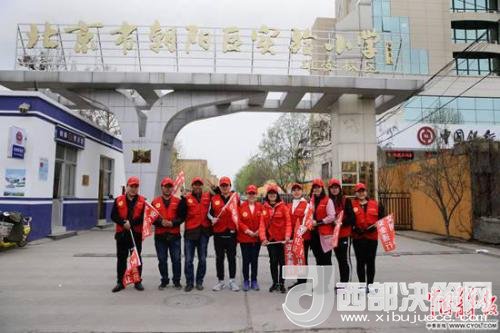 北京市朝陽區(qū)實驗小學(xué)雄安校區(qū),參加“家校警”護(hù)學(xué)隊的當(dāng)?shù)丶议L志愿者在校門口。