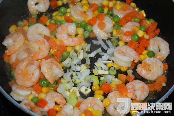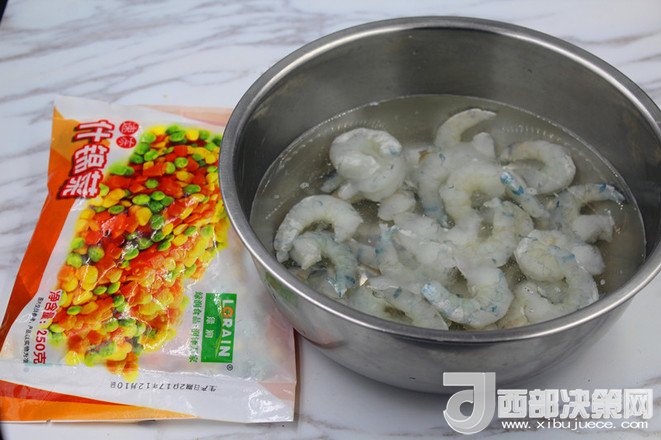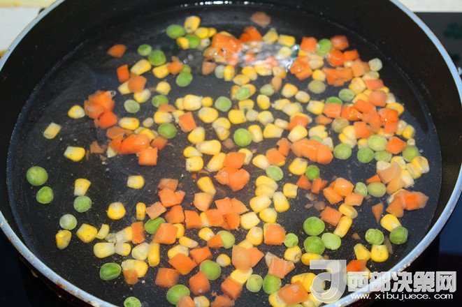 3.蔬菜粒用開(kāi)水焯一下?lián)瞥隹馗蓚溆?/div>