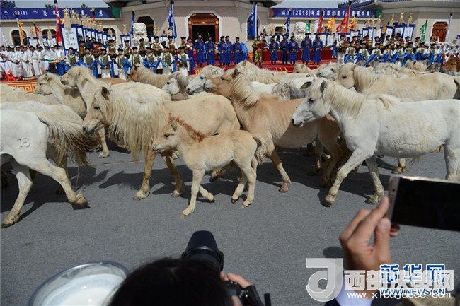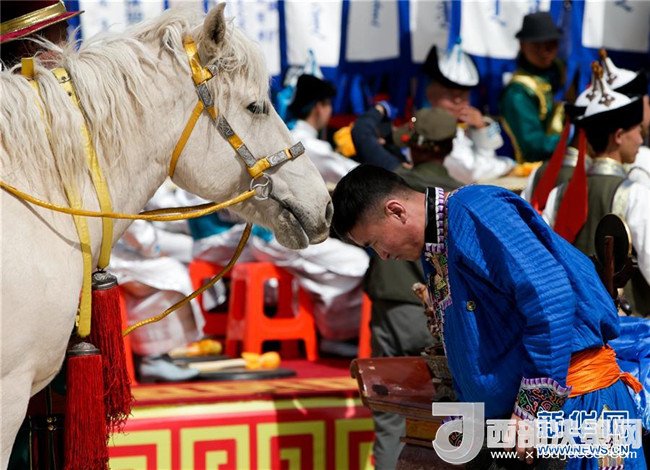 這是在成吉思汗陵春季大祭現(xiàn)場(chǎng)拍攝的白馬(5月6日攝)。新華社記者 鄒予 攝