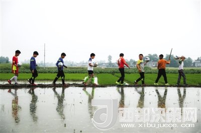 4月21日,四川省綿陽市迎新鄉(xiāng)小學(xué)足球隊(duì)的隊(duì)員們走在鄉(xiāng)間的田埂上,周末即使沒有訓(xùn)練,他們也會約著一起玩球。