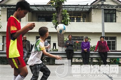 兩名小球員在街道上邊走邊玩球。有些鄉(xiāng)親還是認(rèn)為踢球是不務(wù)正業(yè),會影響讀書。