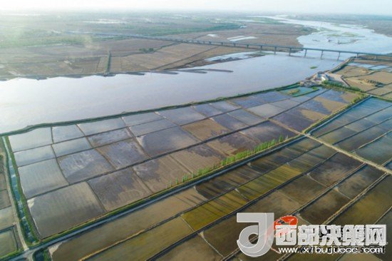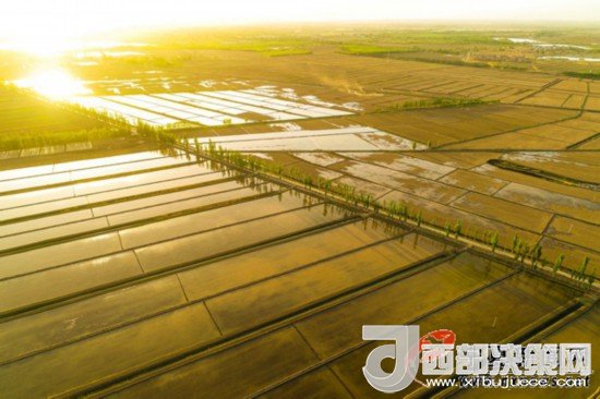 5月6日18時(shí)50分許,伴著落日金色的余暉,銀川市賀蘭縣黃河邊剛剛灌水的稻田波光粼粼,銀川平原引黃灌區(qū)稻田灌水,即將進(jìn)入插秧季。 寧夏新聞網(wǎng)記者 祁瀛濤 攝