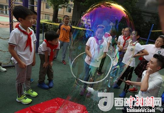 孩子們體驗(yàn)被泡泡罩住的感受。 泱波 攝