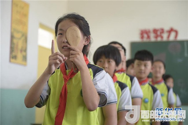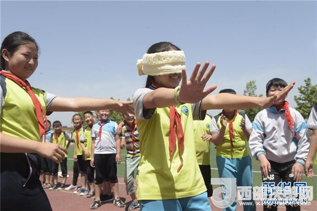 6月5日,廊坊市安次區(qū)仇莊鄉(xiāng)大王務(wù)中心小學(xué)學(xué)生在操場上體驗(yàn)蒙眼行進(jìn),通過游戲的方式感受保護(hù)視力的重要性。