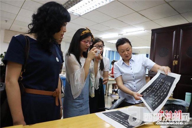 6月9日,古籍修復師王曉紅在給民眾展示拓片。中新社發(fā)瞿宏倫攝