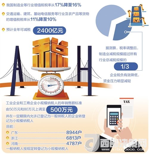 從5月1日起,我國制造業(yè)等行業(yè)增值稅稅率從17%降至16%,交通運輸、建筑、基礎(chǔ)電信服務(wù)等行業(yè)及農(nóng)產(chǎn)品等貨物的增值稅稅率從11%降至10%,預計全年可減稅2400億元。