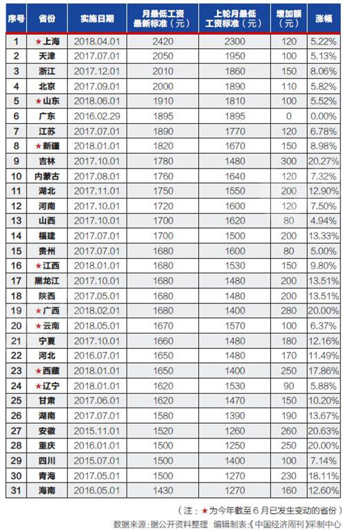 據(jù)記者不完全統(tǒng)計,截至6月6日,全國已有山東、上海、新疆、遼寧、江西、西藏、廣西和云南等8個省區(qū)市上調(diào)了2018年最低工資標準。自2016年以來,已有29個省份上調(diào)了最低工資標準,至今未調(diào)整的是四川省和安徽省。不過,這兩個省也已經(jīng)明確表示今年將提高最低工資標準,如果順利實施,意味著今年上調(diào)最低工資標準的地方已經(jīng)擴容至10省市。
