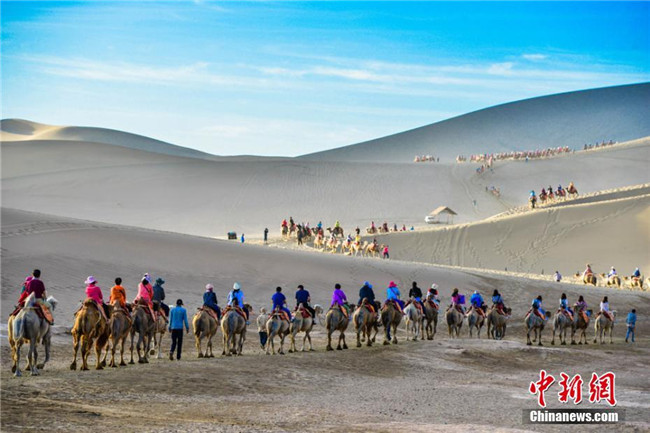 剛剛過去的端午小長假期間,絲綢之路國際旅游名城甘肅敦煌迎來旅游高峰,鳴沙山月牙泉人流如織、駝隊如龍,世界文化遺產(chǎn)莫高窟“門庭若市”。據(jù)敦煌市旅游部門19日統(tǒng)計,今年端午節(jié)期間,敦煌市接待中外游客12.35萬人次,同比增長35%。其中,莫高窟接待游客21501人次,同比增長29.44%;鳴沙山月牙泉景區(qū)接待游客24050人次,同比增長31.86%。