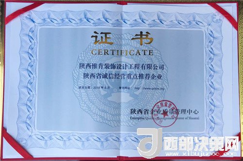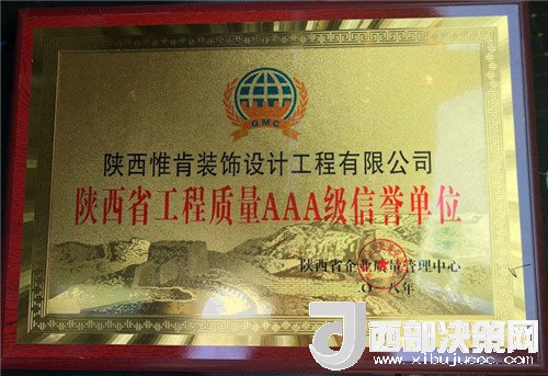 西部決策網(wǎng)——西部大開發(fā)訊(帥華鋒 張曉紅)近日,寶雞市惟肯裝飾榮獲陜西省企業(yè)質(zhì)量管理中心頒發(fā)《陜西省工程質(zhì)量AAA級信譽單位》和《陜西省誠信經(jīng)營重點推薦單位》兩項榮譽稱號。