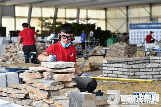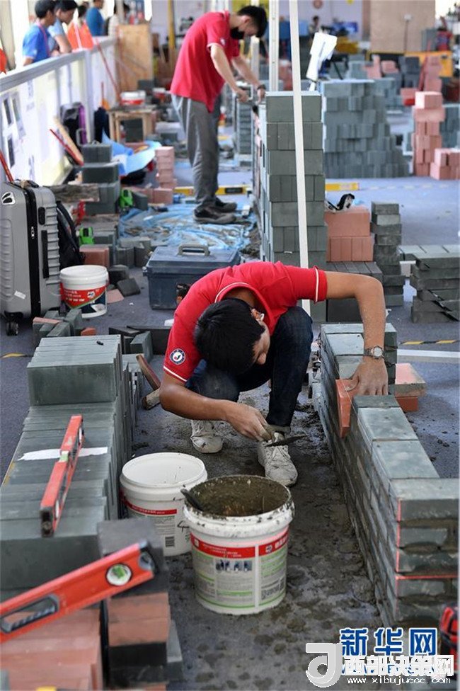 在第45屆世界技能大賽全國選拔賽廣東賽區(qū)比賽現(xiàn)場,選手們在砌筑項目中進行操作(6月25日攝)。新華社記者 梁旭 攝