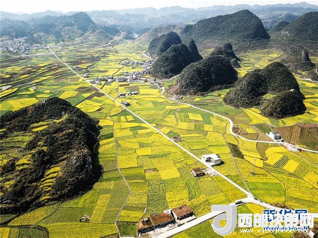 六盤水市六枝特區(qū)木崗鎮(zhèn)的油菜花田(3月9日無人機(jī)拍攝)。