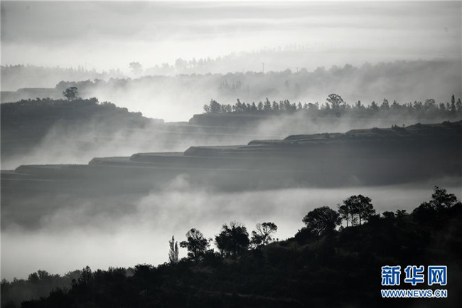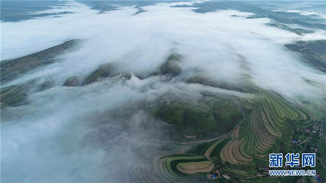 云霧繚繞的寧夏彭陽縣金雞坪梯田公園(7月17日攝)。新華社記者王鵬攝