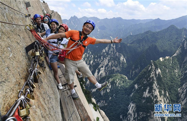 被譽為“華山第一天險”的長空棧道,位于陜西省華陰市五岳華山南峰東側山腰,在萬仞絕壁上鑲嵌石釘搭木椽而筑。 由于長空棧道貼崖懸空,對探險獵奇者極具誘惑性和挑戰(zhàn)性,吸引歷險探勝者絡繹不絕。新華社記者 陶明 攝