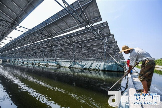 7月25日,在湖州市和孚鎮(zhèn)陳塔村,養(yǎng)殖戶清理光伏板下的魚塘內(nèi)的漂浮物。