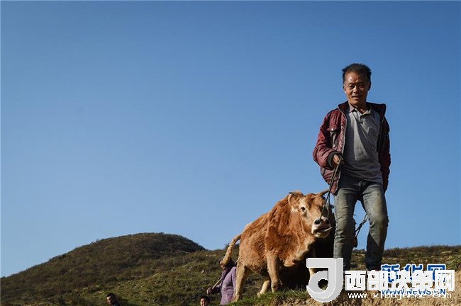 貴州畢節(jié)市七星關(guān)區(qū)長春堡鎮(zhèn)埡關(guān)村農(nóng)民張祥印在放牛(2015年11月14日攝)。張祥印是當?shù)氐呢毨簦昃兪杖胫挥幸磺Ф嘣?015年,七星關(guān)區(qū)推出精準扶貧套餐,張祥印選擇了養(yǎng)牛,走上脫貧致富之路。新華社記者 歐東衢 攝